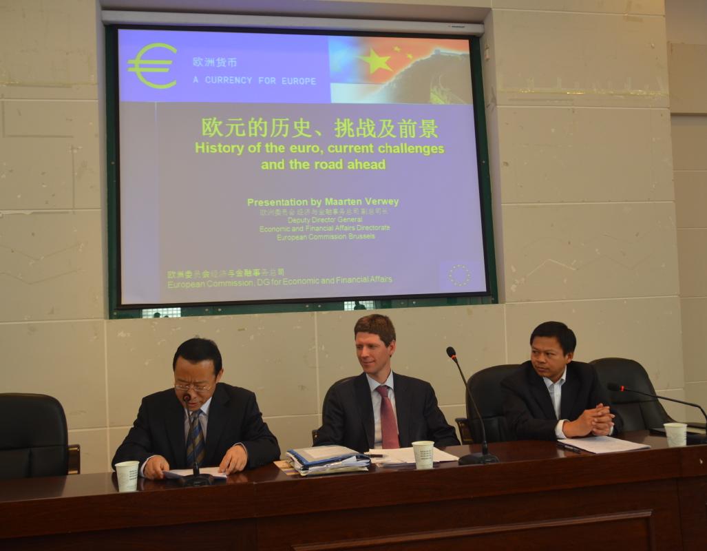 4月11日,由欧洲委员会经济与金融事务总司、欧盟驻华代表团和我院联合举办的欧元展学术报告会在金海报告厅举行,报告会的主题是“欧元的历史、挑战及前景”。来自中国人民银行和欧盟驻华代表团的代表出席了活动,来自陕西电视台、西安日报社和西部网等五家媒体对活动进行报道,我院260余名师生聆听了报告。报告会由西北大学党委副书记黄建民主持。
