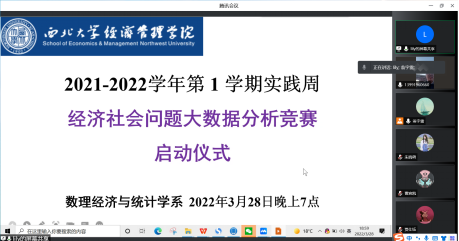 2022年3月28日至4月1日,数理经济与统计学系成功举行了以“经济社会分析大数据分析竞赛”为主题的教学实践周活动。竞赛围绕当下经济社会关注的热点问题,以新冠疫情影响、西部地区经济发展、黄河流域生态环境保护等问题为主题设计了竞赛题目。在系主任茹少峰教授和王莉副教授的带领下,青年教师南士敬、张涛、翁宇雷、宋文月、李宗欣和马聪参与了本次实践周的指导工作。数理经济学(实验班)和经济统计学两个专业三个年级共192名学生参与了本次活动,参与学生跨年级组成29个团队参加此次竞赛。受疫情影响,本次活动采用线上和线下结合的方式进行。