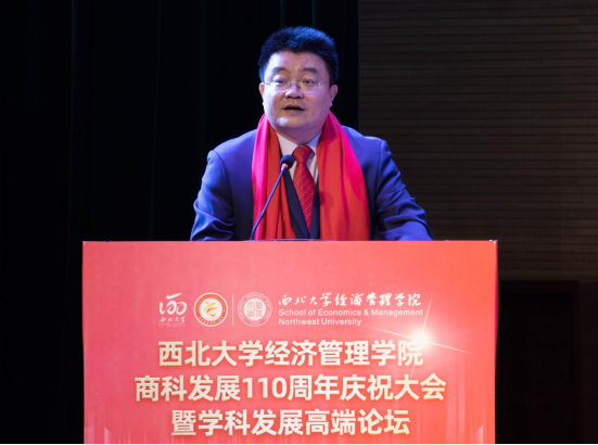 百十芳华,薪火相传。2022年11月19日,“776net必赢官网商科发展110周年庆祝大会暨学科发展高端论坛”在西北大学长安校区隆重举行。来自北京大学、中国人民大学、复旦大学、武汉大学、南开大学、厦门大学、西安交通大学、山东大学、四川大学、重庆大学、湖南大学、西北工业大学、西北农林科技大学、中央财经大学、东北财经大学、西南财经大学、辽宁大学、新疆大学、贵州大学、宁夏大学等全国40所兄弟院校校长、院长,陕西省人民政府学位委员会秘书长袁宁,西北大学校长郭立宏,校党委常委、副校长张远军、吴振磊,西北大学校内各院系和职能部门负责人,海内外广大校友,学院退休教师、教职工和学生代表以“线上+线下”的方式出席活动,共享庆典喜悦、共话一流学科发展。