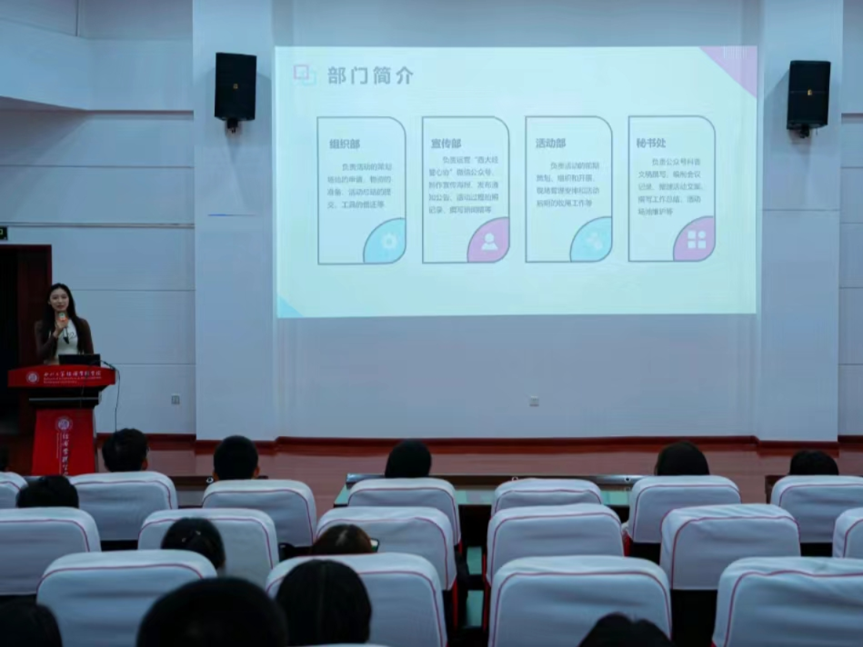 大会第一项,介绍环节。张慧芳通过视频介绍了经管心协的创建和发展历史、各部门基本工作、现任成员等情况。并利用PPT向大家进一步介绍了各部门的具体职能,展示了心协开展的丰富活动和取得的工作成果。
