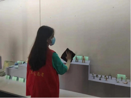 完成讲解工作后,第一小队成员参与了文物展柜清洁工作。社区开展此类的志愿者卫生活动,以实际行动践行社区环境卫生保护的责任与义务,展现了服务群众、奉