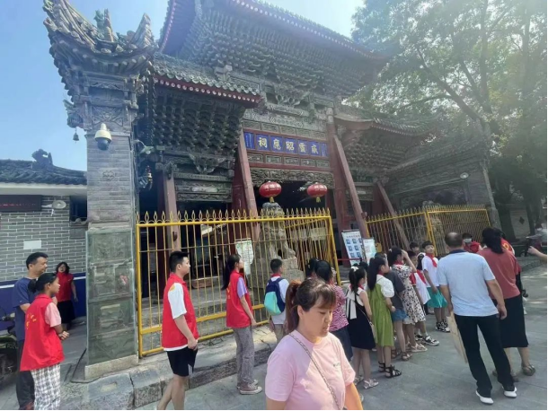 志愿者带领小学生在城隍庙参观