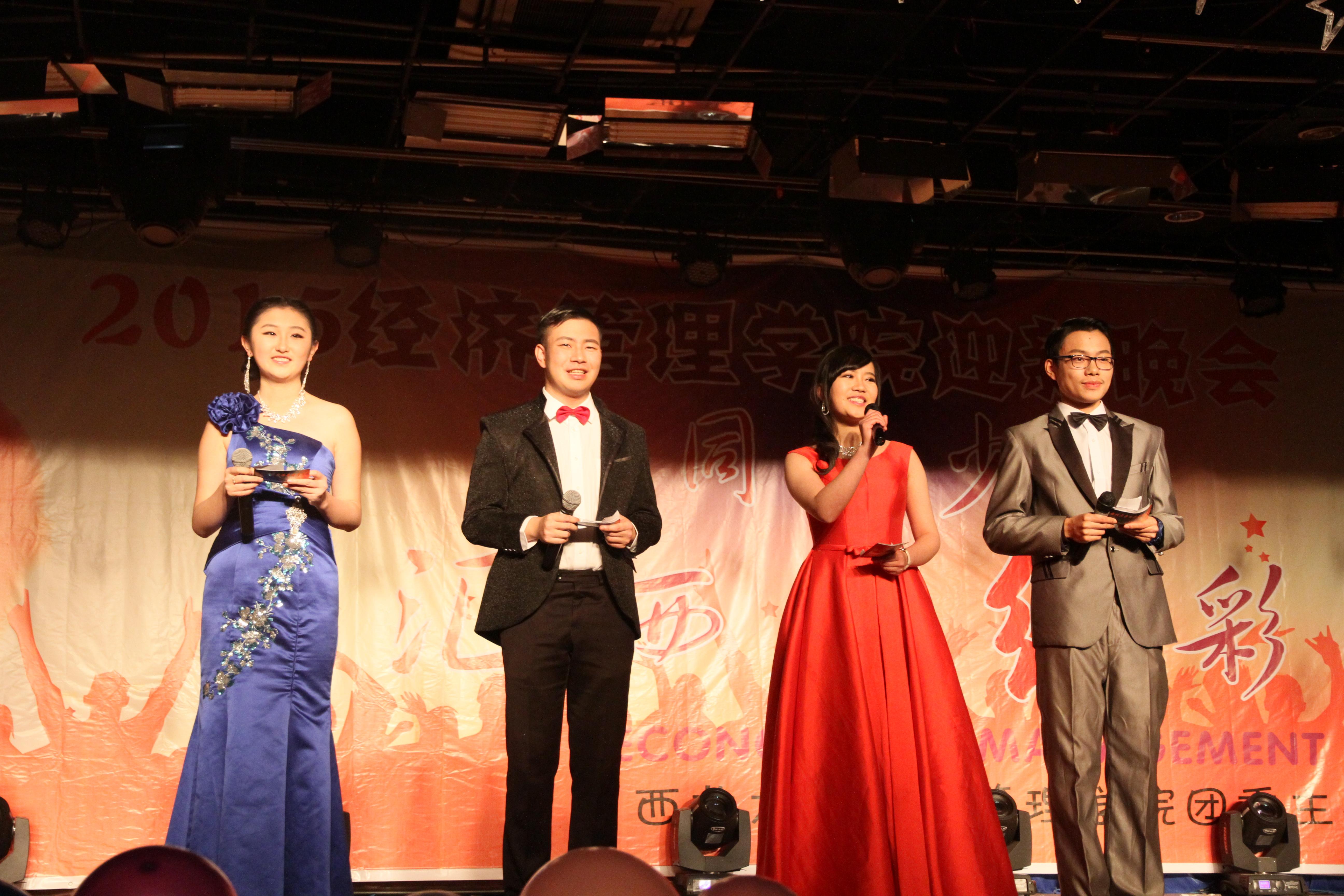 晚会在同学们精心设计的开场秀中拉开了帷幕,装扮成活泼可爱的“小黄人”从各个方向进入会场,他们一边载歌载舞,一边向现场的观众们派发礼物,着实给了全场观众一个惊喜,晚会的氛围也瞬间被引爆。在主持人闪耀登场后,节目正式开始,晚会分为了“相逢”、“青春”、“梦想”三个篇章,所有节目均由2015级学生自编自导自演,节目形式多样,工商一班、信管班、旅游管理班分别带来了歌曲串烧《致青春》、独唱《望月》、歌舞《youth boom》,为大家上演了试听盛宴;国贸班的舞台剧《在青春的日子里》带领大家回忆了从高中到大学这段青葱岁月,展现了大一新生初入大学校园的心路历程;金工班的《西大梦想秀》、工商二班的《与梦想有关的日子》,为大家展现了经管学子对于梦想的理解和追求。院学生会也准备了舞蹈、话剧、朗诵、脱口秀等形式各样的节目,晚会精彩纷呈、高潮迭起。
